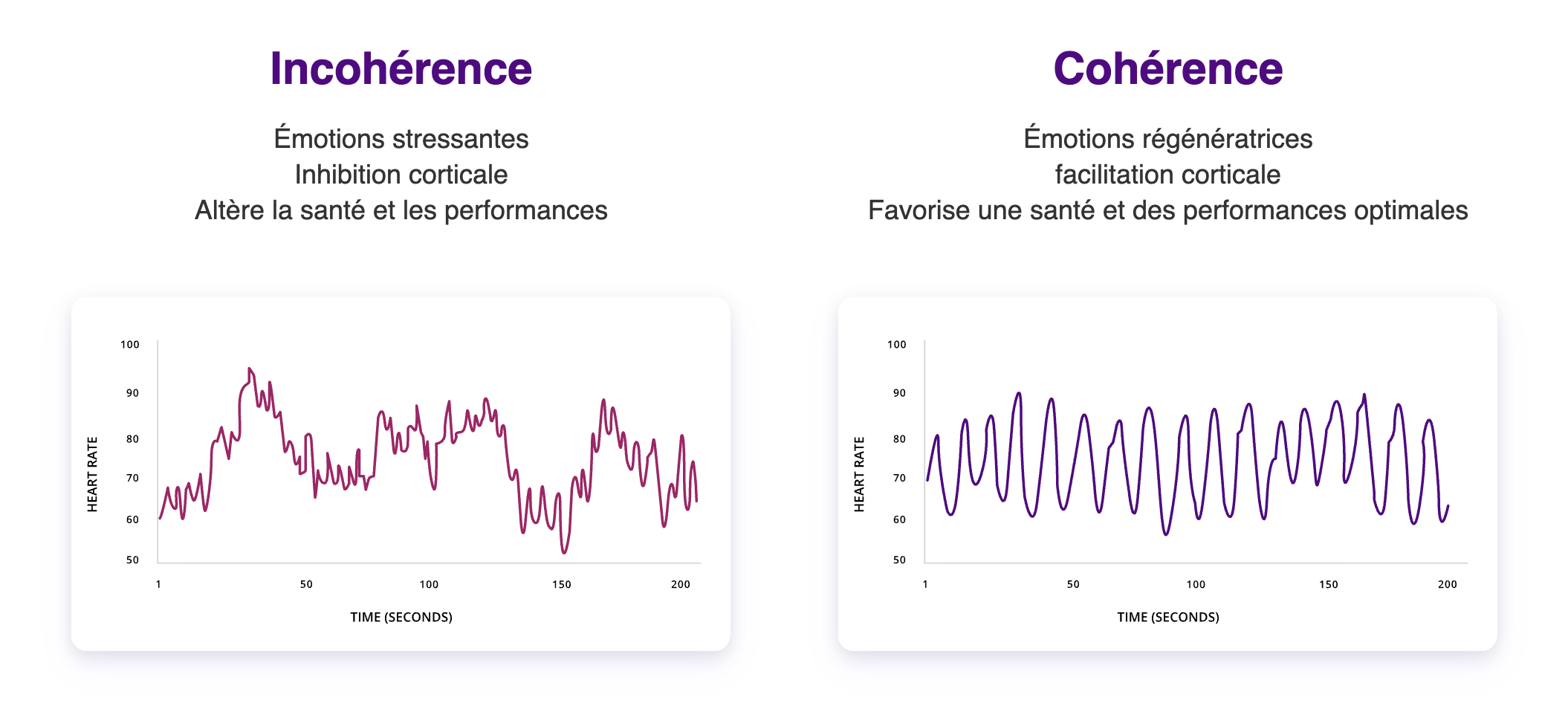 Graphique B à droite (Cohérence) : La même moyenne de 70 BPM, mais avec une onde sinusoïdale ample et régulière. Le dirigeant est en pleine possession de ses moyens cognitifs.